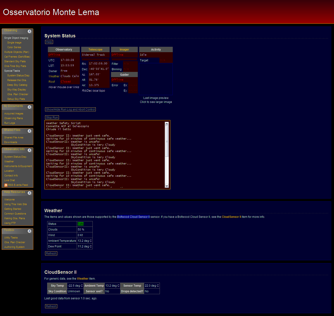 I've spent about 30 nights on the top of a mountain (can't count the ones in 'lowland') working on this project, it was really fun and exciting. My work mostly consisted in taking care of all security aspects (to avoid damages) with a (limited) Siemens PLC S7-200 which I'm now sure that was a too lower series for this kind of purpose. (unfortunately discovered too late)One important feature of this solution is that every possible alarms that happens are signaled by the PLC via email (and maybe later by SMS). For most common alarms (like sky becoming cloudy) the PLC take care of it by himself. There is anyway some situation where the human action (remote or in extreme case in place) is needed.