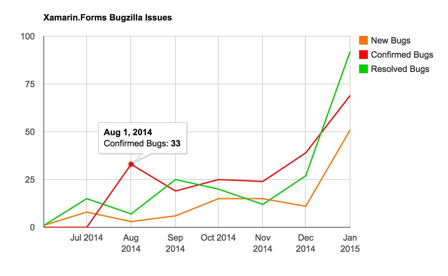 The chart above shows an example of the bugs count in Xamarin.Forms by status. Data are taken from the Xamarin Bugzilla website via the CSV feed.